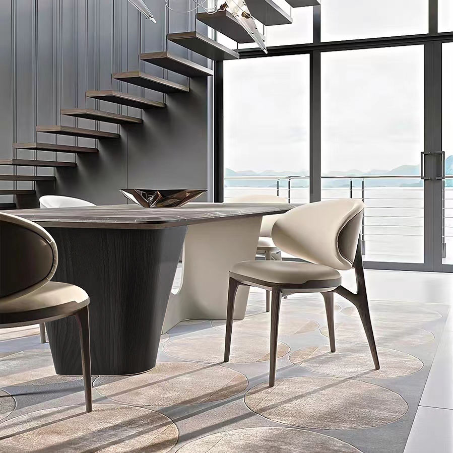 A modern marble dining table and chair set with a rectangle stone top, perfect for kitchen and dining room spaces. Elegant designer home furniture set.